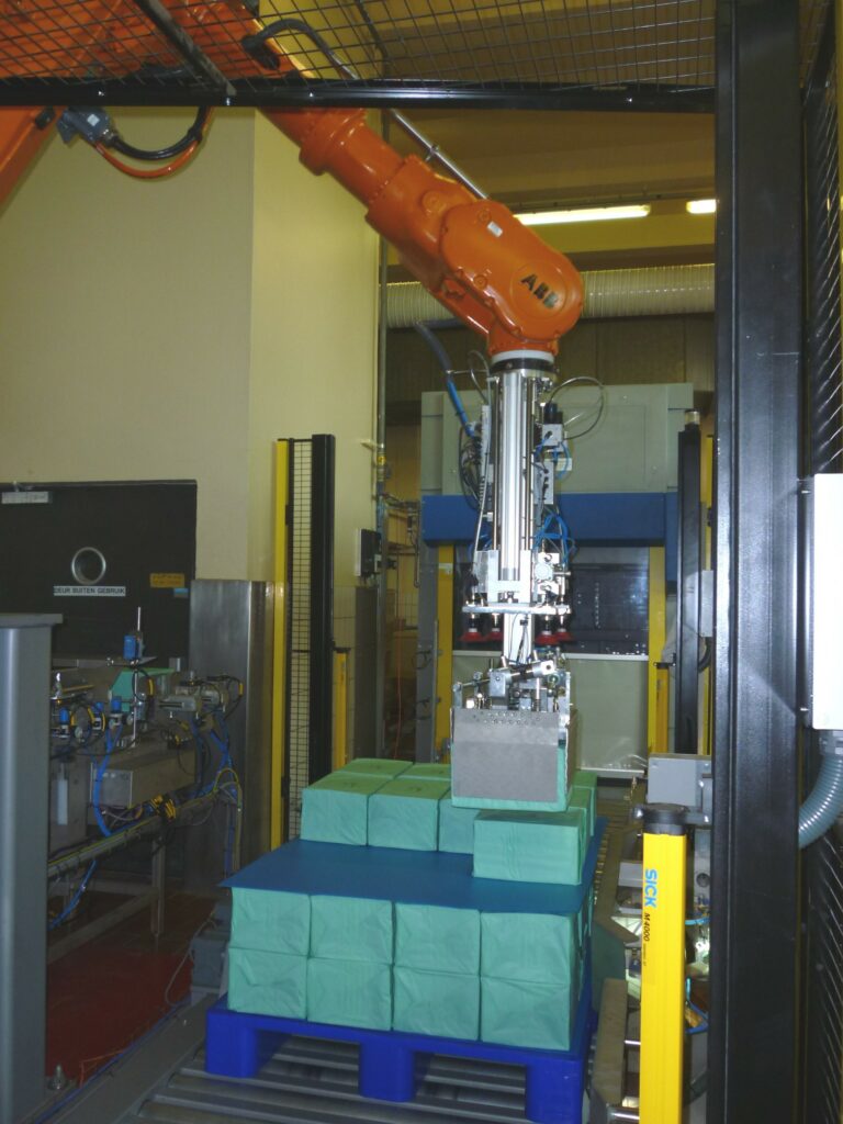 We vernieuwden de bestaande palletiseerlijnen en voegden een robot toe, o.a. om de blokjes te selecteren, vast te pakken en te stofzuigen. Het gemeenschappelijk vervoer naar de underground is splinternieuw.